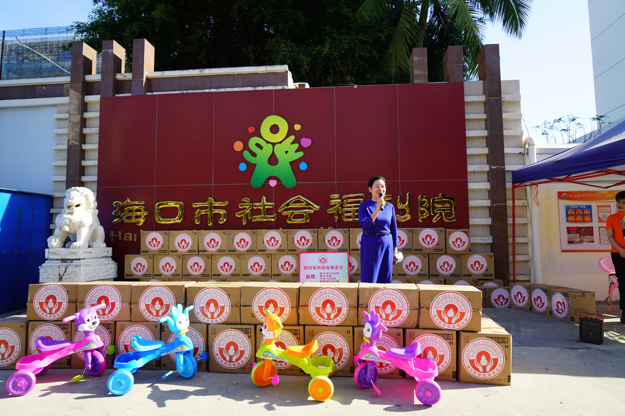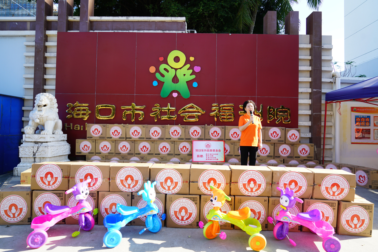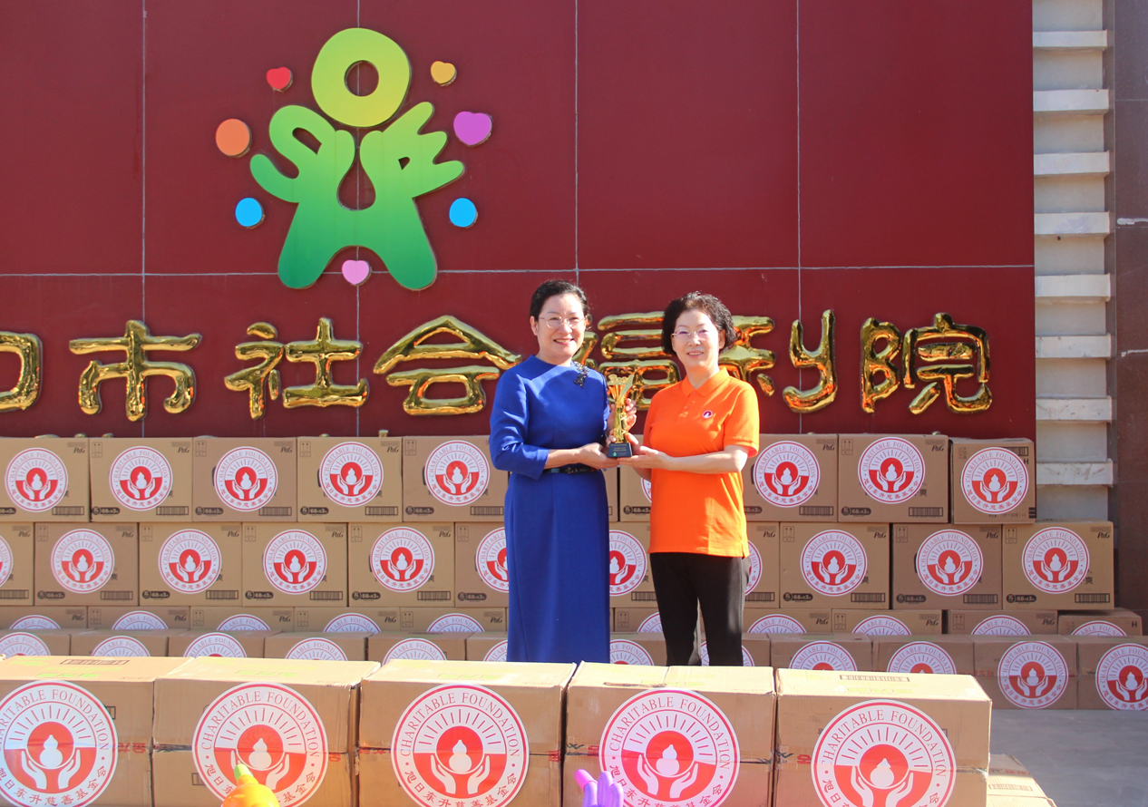 在温馨的氛围中,刘景萍女士向福利院儿童捐赠了药品、尿不湿、食用油、玩具车等物品。唐凤英院长向刘景萍董事长赠送奖杯,感谢长期以来对海口市社会福利院的爱心与支持。