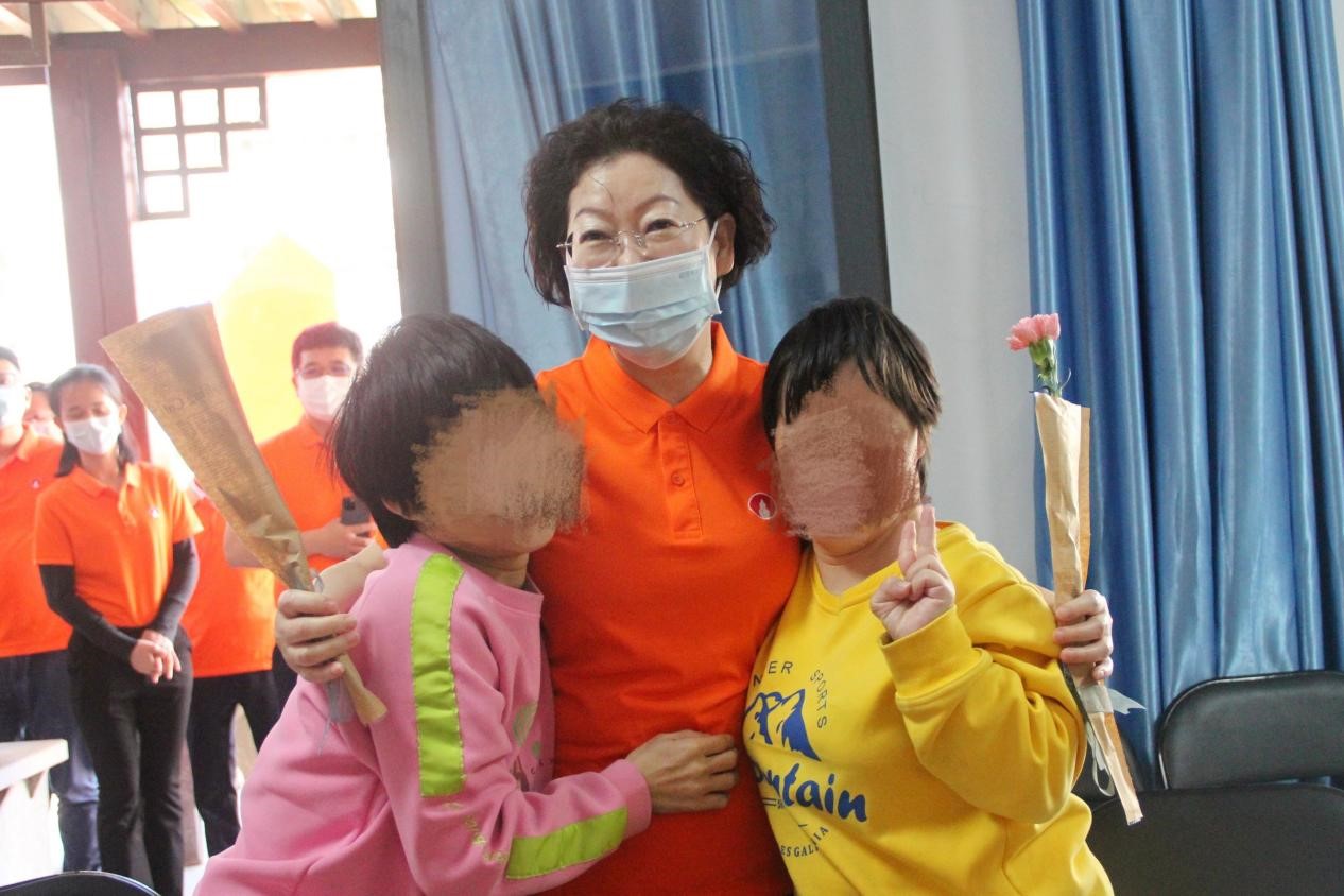 由于疫情管控原因,福利院处于半开放模式。唐凤英院长带领大家参观了福利院的部分儿童活动场所,介绍了孩子们的生活和学习情况。刘景萍女士一行与孩子们亲切互动交流,其乐融融。