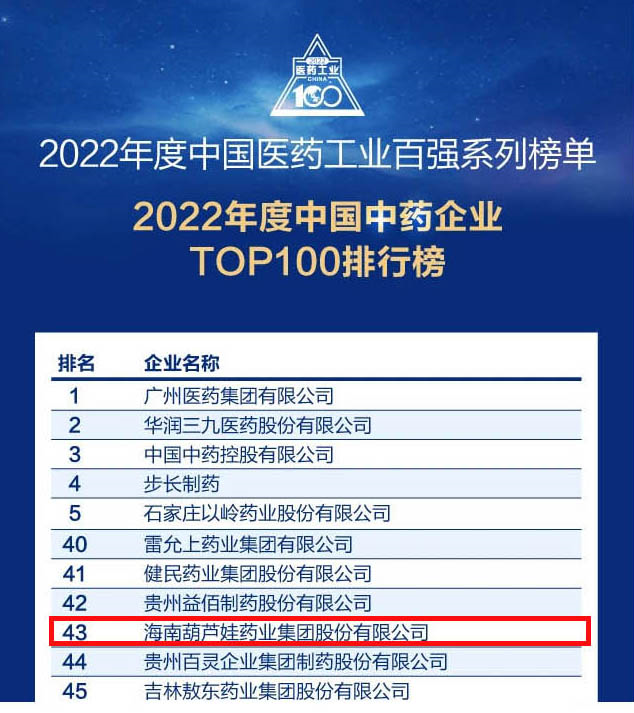 会议期间,一年一度的中国医药工业百强系列榜单隆重揭晓,尊龙凯时集团凭借领先的研发优势和扎实的生产实力以及稳健的市场推广能力,连续第四年成功入选“2022年度中国中药企业TOP100排行榜” ,排名稳步上升至第43位。